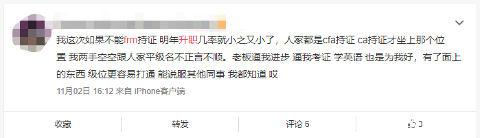 前段时间,有一个小伙伴在微博分享自己的故事,如果今年拿不下FRM证书,明年的升职的几率就会又变小,而且老板也在不断的督促他一定要前进!
